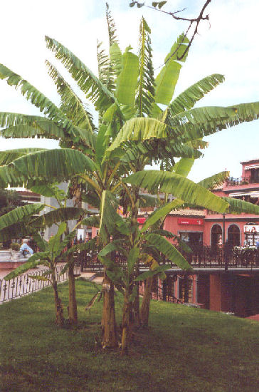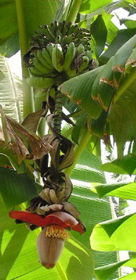 | Musa balbisiana in Puerto de la Cruz/Teneriffa/Kanarische Inseln (Foto: Joachim Jäck) | Fruchtstand mit männlichen Blüten (Foto: Gabriel Sachter-Smith/USA) |