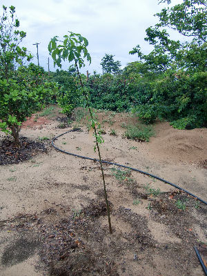 The baobab goes through four stages according to the trunk form. In the first phase (up to 10 - 15 years), it grows without a pronounced increase in thickness to a level approaching from 13 to 20 feet (4 to 6 meters), the branches extend upward at an acute angle. It grows relatively quickly in youth, at first from 3 to 4 feet (80 to 100 cm) per year. In this phase you will find our baobab, which was planted only on Dec. 3rd, 2010. In the second phase at the age of 60 - 70 years the base swells to a conical shape, is 17 to 50 feet (5 to 15 meters) high and up to 7 feet thick, the tree blooms and bears fruit for the first time beginning at the age of 30 to 40 years the branches of the tree to grow rectangular and take away much from that point in their length growth. The stem is thick and only slowly developed in the age of 200 to 300 years in a bottle shape. A tree may be the age of 100 years, when it has a trunk with diameter of 13 to 17 feet (4 to 5 meters). In the last phase, it developes a spreading crown and grows only very slowly in width. Often the trunks formed several times and also hollow when very old specimens of up to 800 years. In Africa, hollow stems are used as cattle sheds, grain storage, water storage and also for the burial.