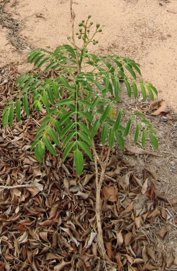The alternate leaves are odd-pinnate, and are 8 to 24 inches long. Each of the nine to 25 leaflets have short stalks, they are elliptical, are with a maximum of 1 inches wide and about 2.4 inches long. The leaf margin is serrated and slightly curved downward. At the beginning of the dry-cool season the leaves fall off, after a few weeks the new sprout will begin.