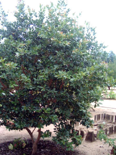 The strawberry guava, a small tree, is native to Brazil, is grown in the tropics and subtropics. The blossoms are white and stand in many bunches together. The shrub has strawberry-sized fruits, which are soft and dark red, when ripen. They taste very aromatic, sweet-sourish and fresh. Today the strawberry guava is less planted for the fruits, but is used as hedge in gardens.