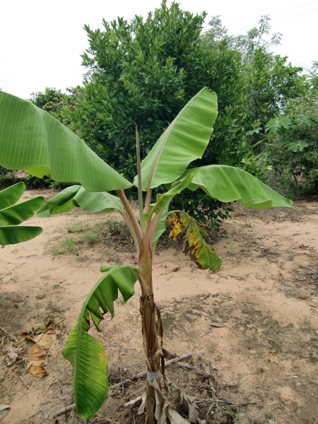 One more than 10 feet tall new breeding from Honduras, which belongs to the group AAAB and to the section Musa, is one Manzano type. The fruits have an applelike taste, can be eaten in-natura or cooked. This cultivar is disease resistant, off all against Black Sigatoka, is also wind and cold tolerant, but not hardy in Germany and Europe, but it needs to be crosses with Musa basjoo or sikkimensis. It is one cross between Musa 'Prata Enane' (AAB) and Musa 'SH-3142' (AA).