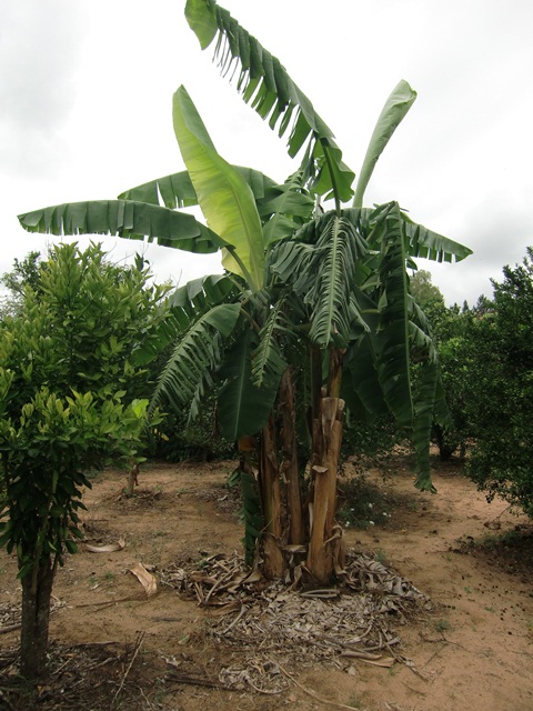 One huge plant of the group AAAB, it is tetraploid and was bred and selected by Embrapa in Brazil, it is similar to Musa 'Prata', but disease resistant and managed amazingly with the sandy soil by good care and fertilization at one suitable place. It belongs to the largest of our largest banana trees, has huge leaves. It came as one small by tissue culture propagated plant to us in 2009 and Antonio kept and grew it, it was the only survived plant of the shipment from Embrapa in 2009. Today I would to prefer plant by tissue culture propagated plants at first into red clay and later transplant into Terra Preta. One new shipment was much more successfully in the red clay soil and at first shaded by palm leaves, but the frost from June 26th 2011 killed one part of the plants, the survived plants are Musa 'Jaipira', Musa 'Preciosa' and Musa 'Garantida' and grew up to huge plants today because of my better experiences of the past years.